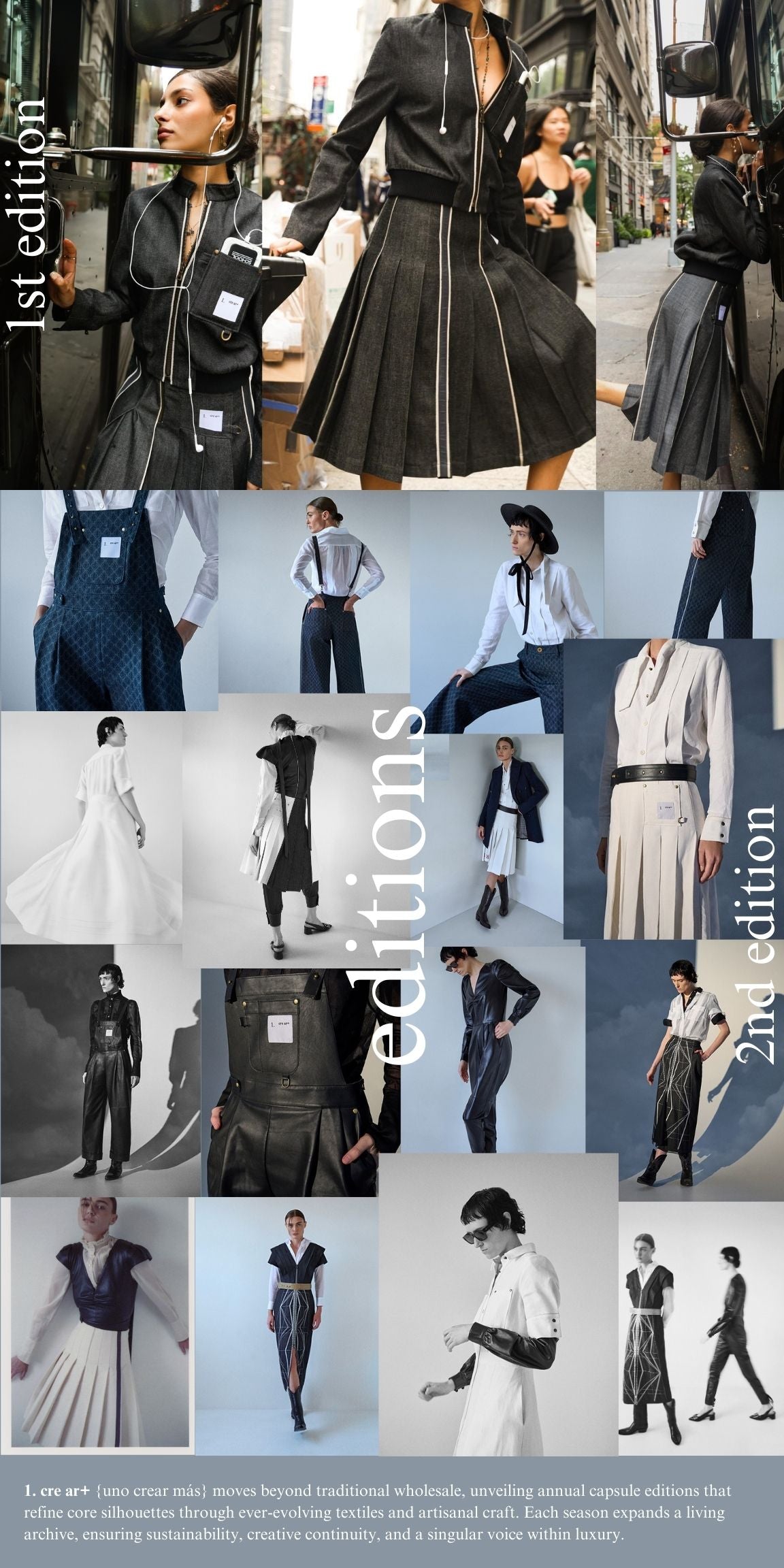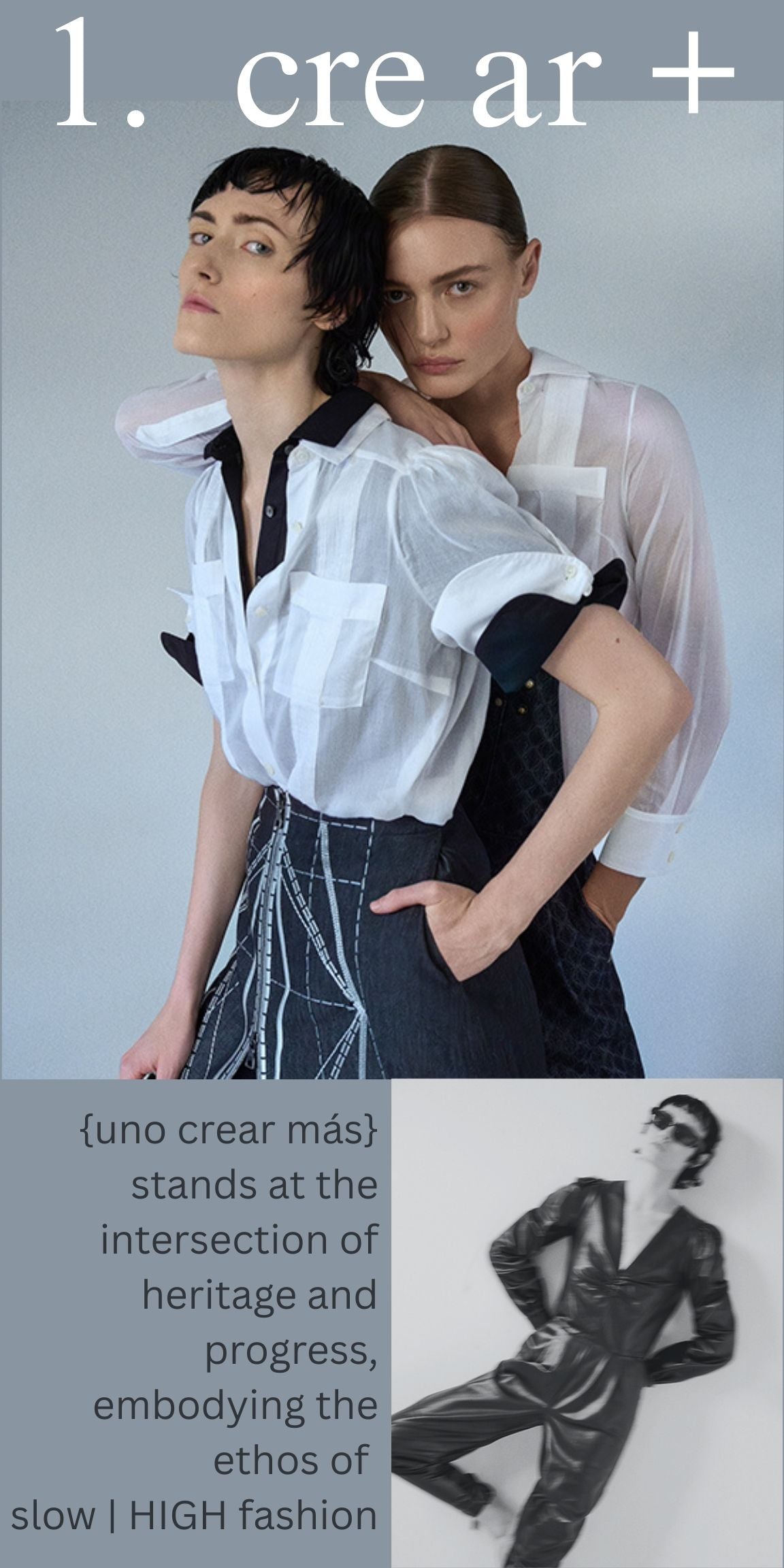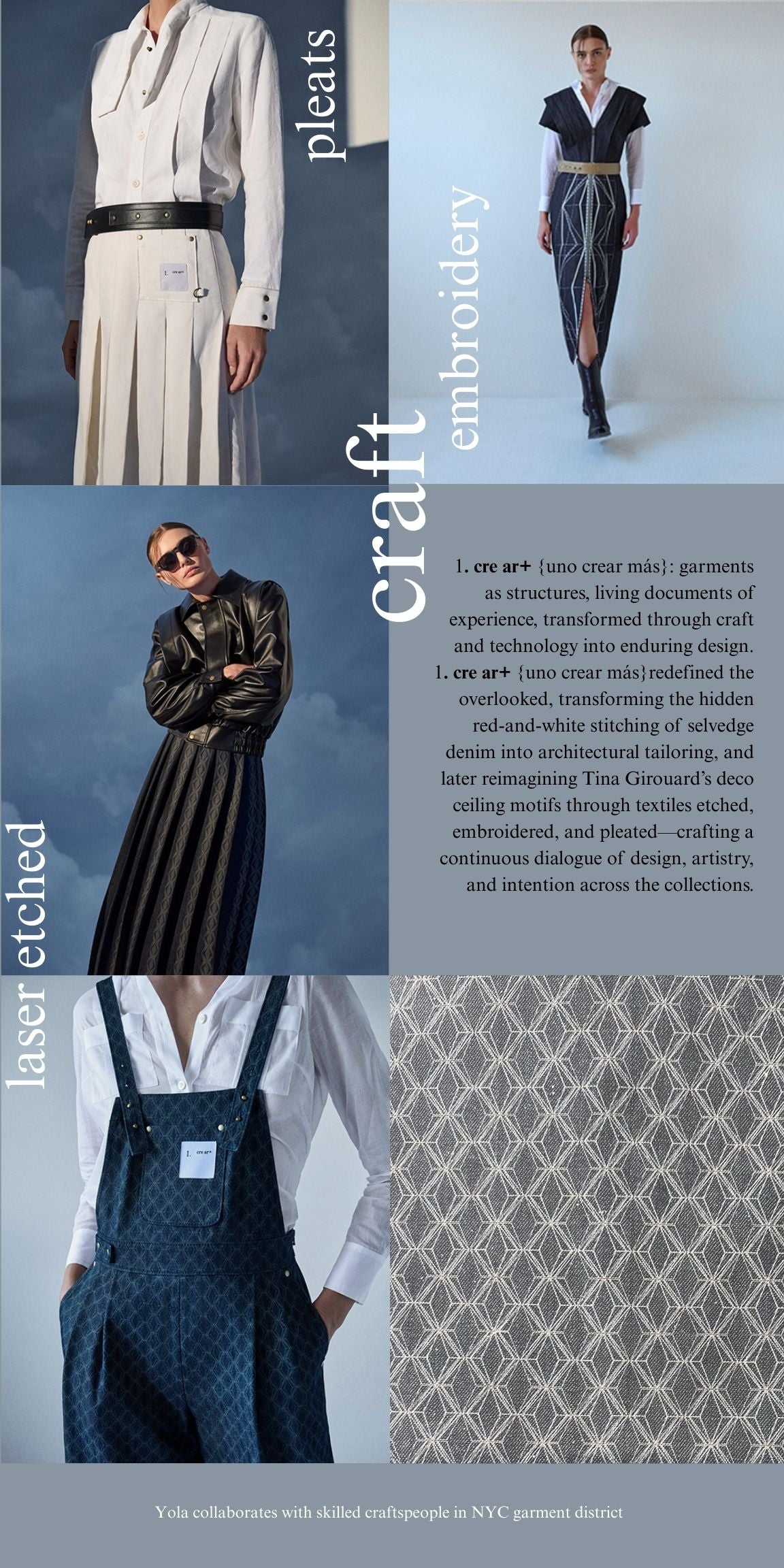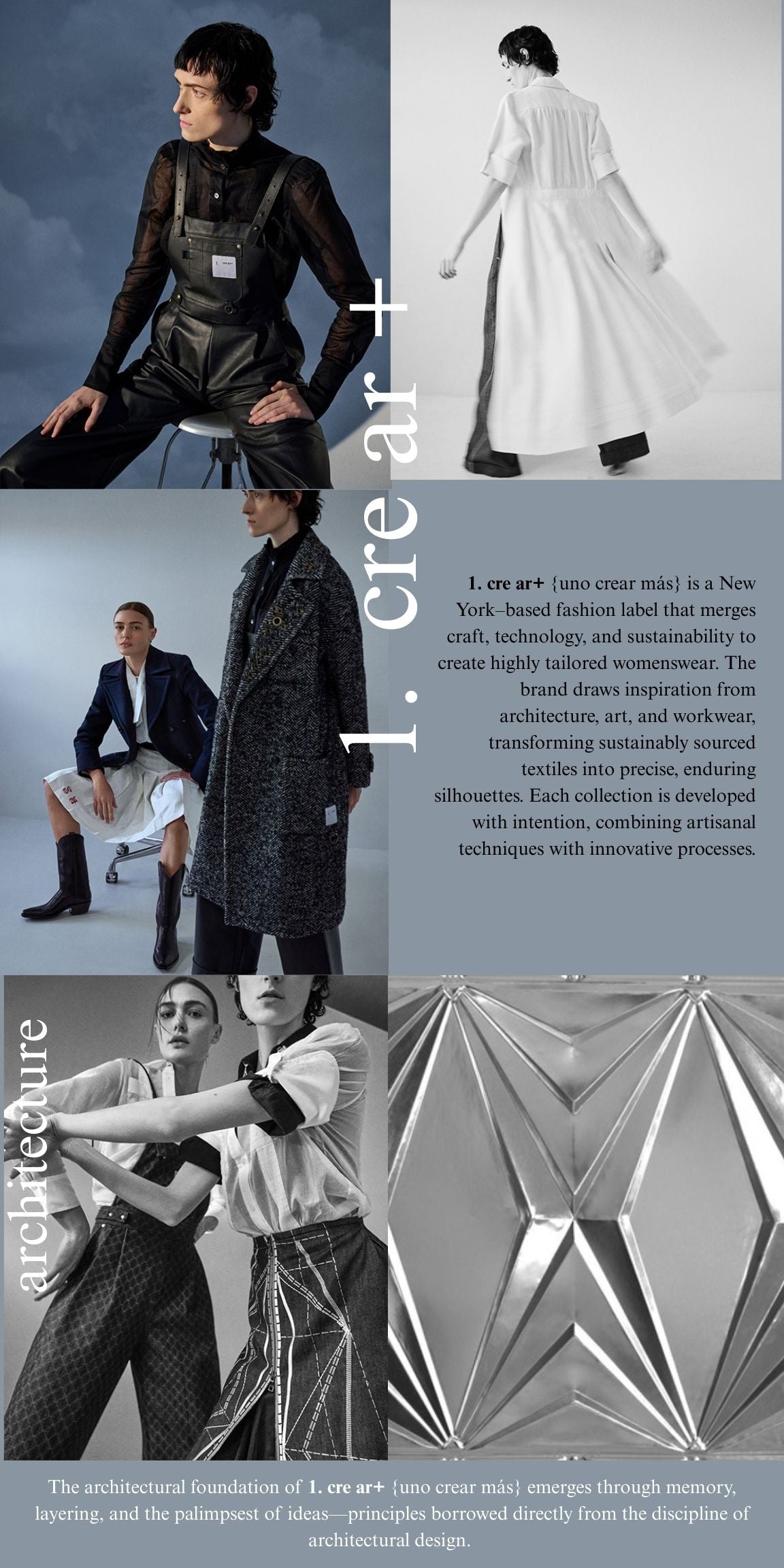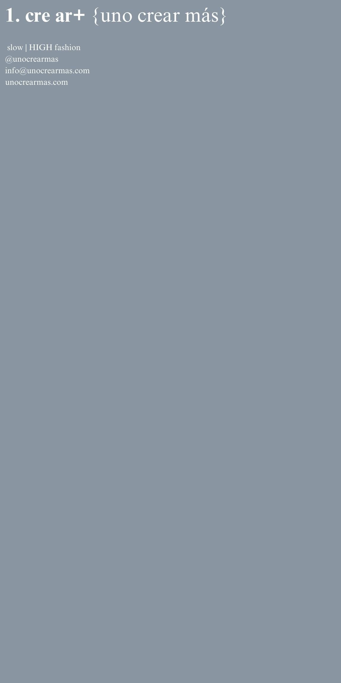 1. cre ar+ {uno crear más} is a Slow|HIGH Fashion atelier based in New York, where architecture, art, and history are distilled through meticulous craft. Technical etching and modern embroidery transform surplus textiles and rare 1980s Japanese selvedge denim into sculpted silhouettes. With the addition of utilitarian hardware, we reinterpret workwear, constructing a modern luxury brand.