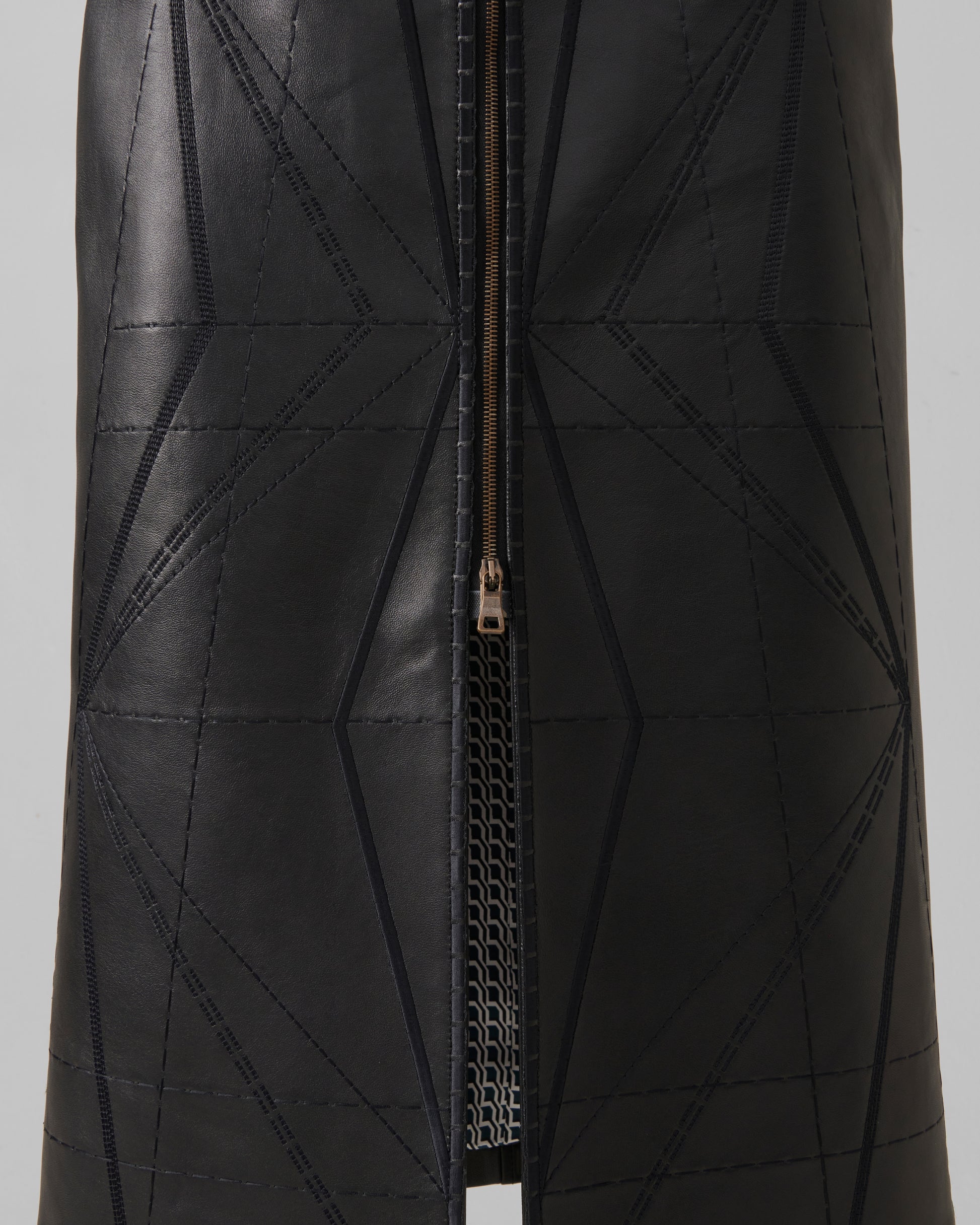 1. cre ar+ {uno crear más} translates architectural linework into haute craft with this midi skirt. Cut from sustainably sourced leather, the A-line silhouette is defined by embridered geometric panels. A two-way antique brass zipper runs through the front, creating both structure and movement, while a patterned lining is revealed with every step. Rooted in the brand’s slow| High fashion ethos, it is conceived as a future heirloom—a piece that merges responsibility, artistry, and sculptural permanence.