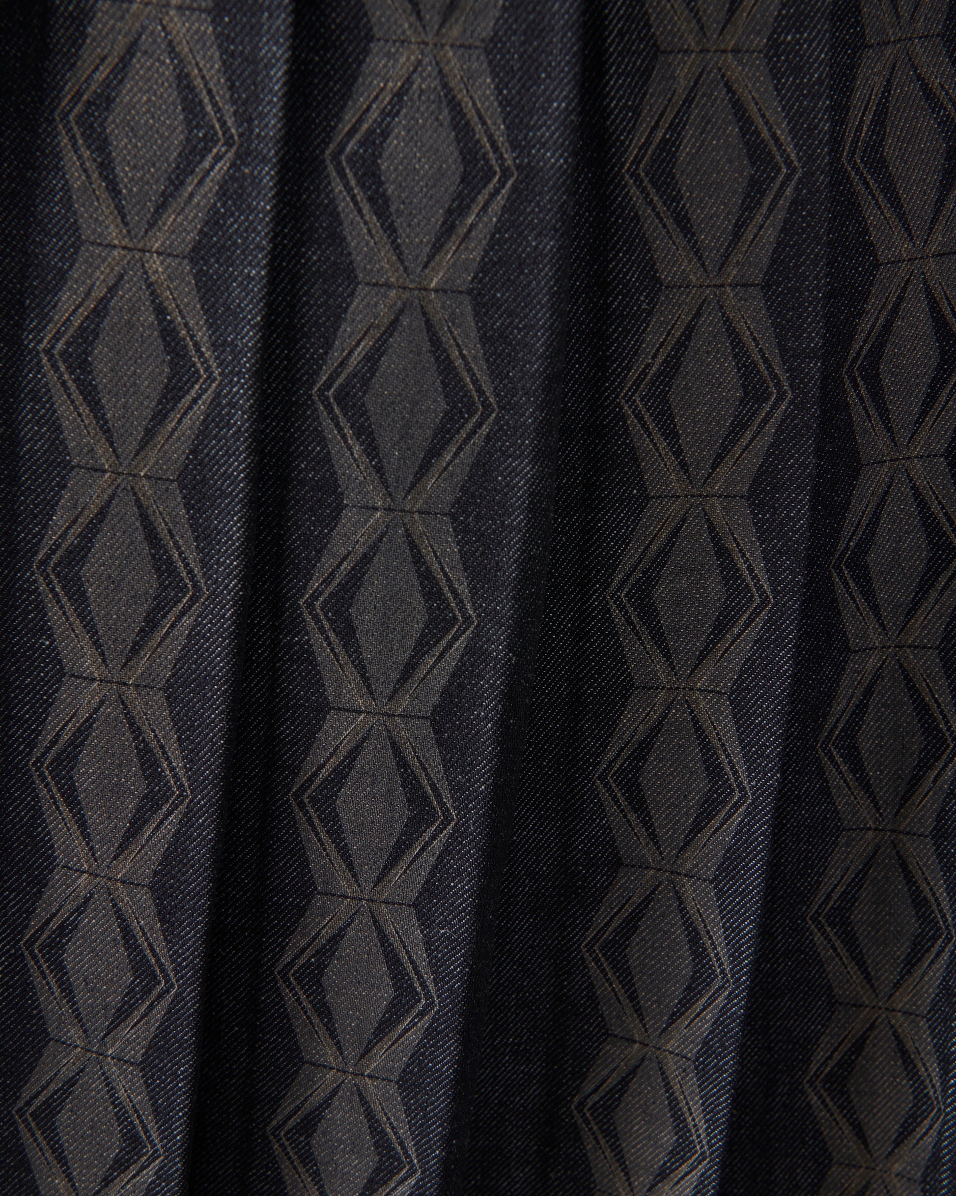 The Deco Pleated Skirt reimagines surplus denim as an architectural textile. Large-scale Deco tiles are laser-etched across the upper pleats, creating bold graphic structure before softening into fluid folds. The high-waisted silhouette elongates the body, while precise pleating highlights the interplay of shadow and geometry. Finished with antique-brass detailing and tailored seams, the skirt merges blueprint precision with couture movement, making it a collectible expression of sustainable luxury.