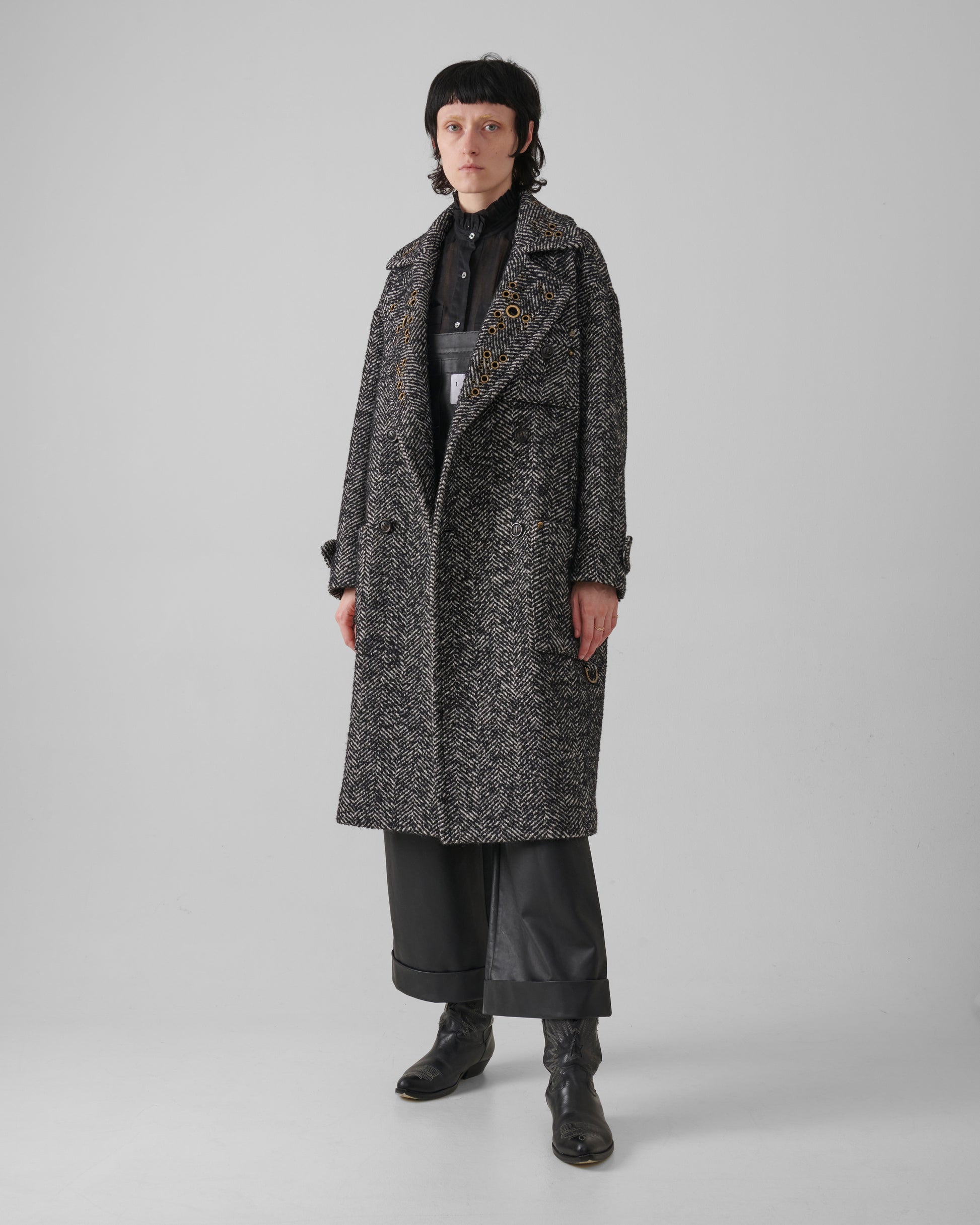 Architectural tailoring meets artisanal detail in this piece from 1. cre ar+ {uno crear más}. Crafted in wool herringbone and lined in pure silk, the silhouette is elevated with natural Corozo buttons, hand-finished grommets on collar, and antique-brass hardware. Each element underscores the brand’s philosophy of merging haute craft with modern functionality—luxury redefined through intention and precision.