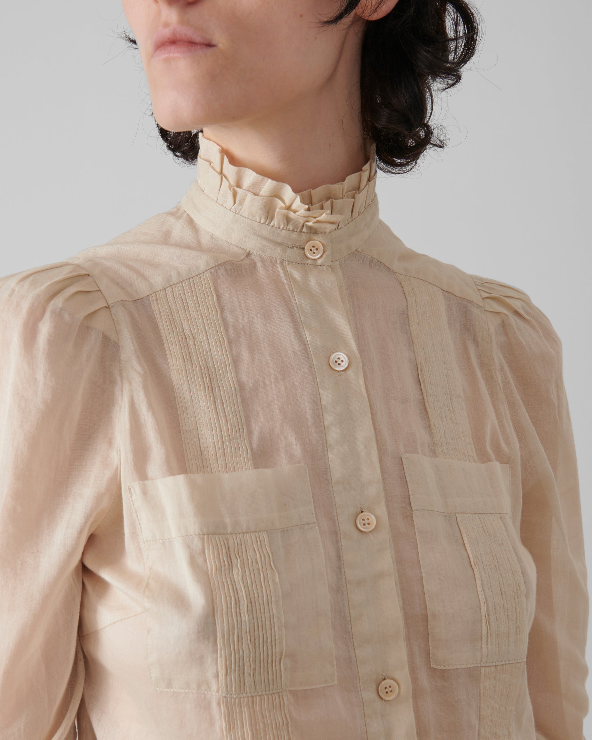 1. cre ar+ {uno crear más} lends a romantic architecture to workwear codes with this high-neck blouse, crafted from sheer cotton voile. The silhouette is defined by a softly ruffled stand collar, pintucked bodice panels, and subtly puffed shoulders that create volume in tension with its delicate transparency. Patch pockets and tonal buttons anchor the design in function, while the meticulous detailing speaks to artisanal craft.