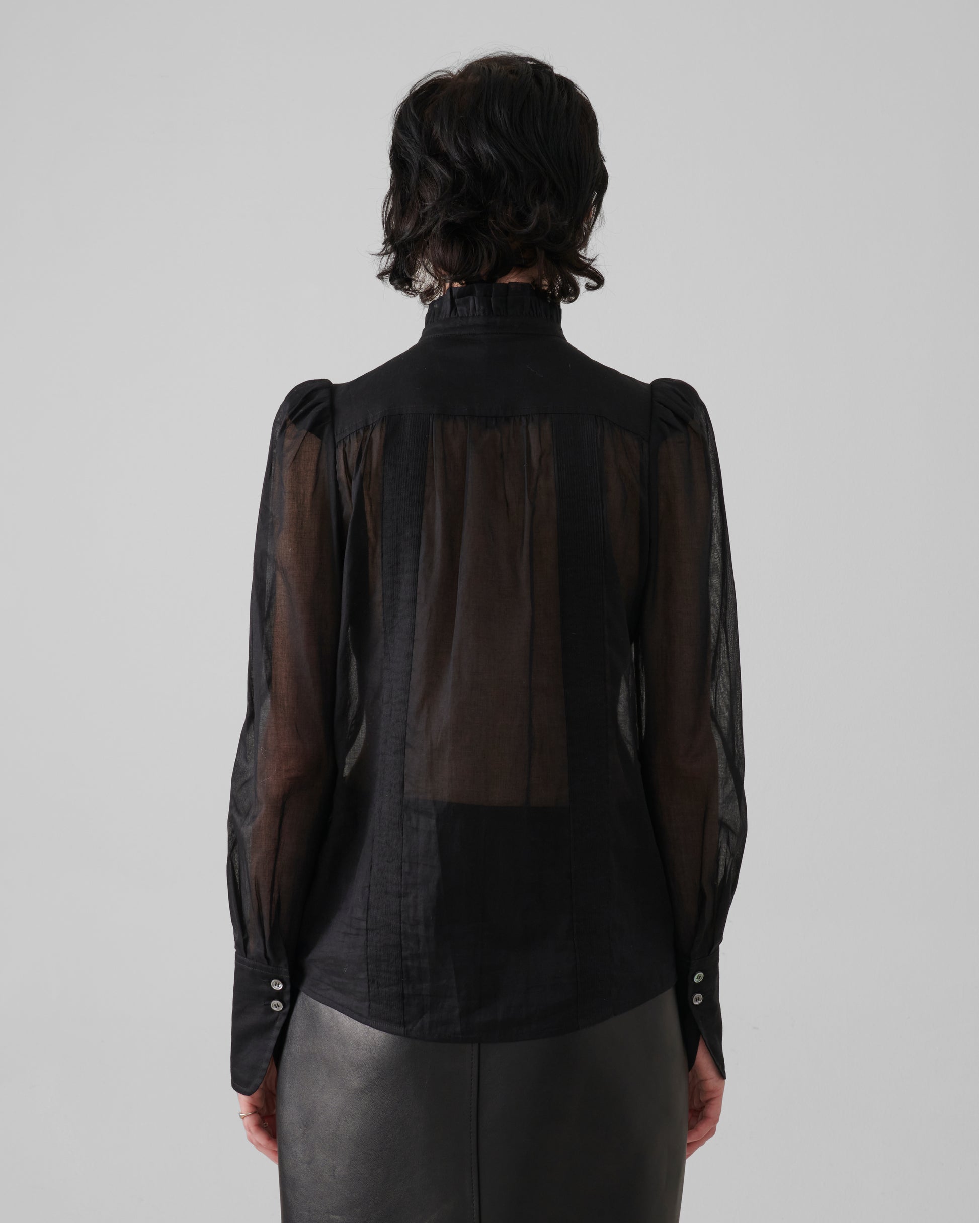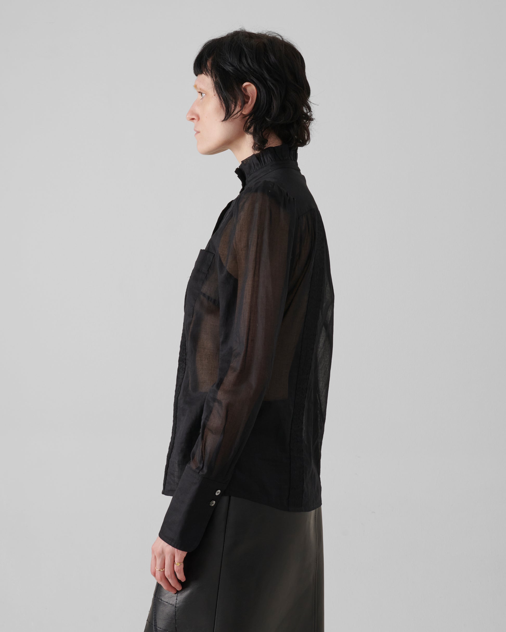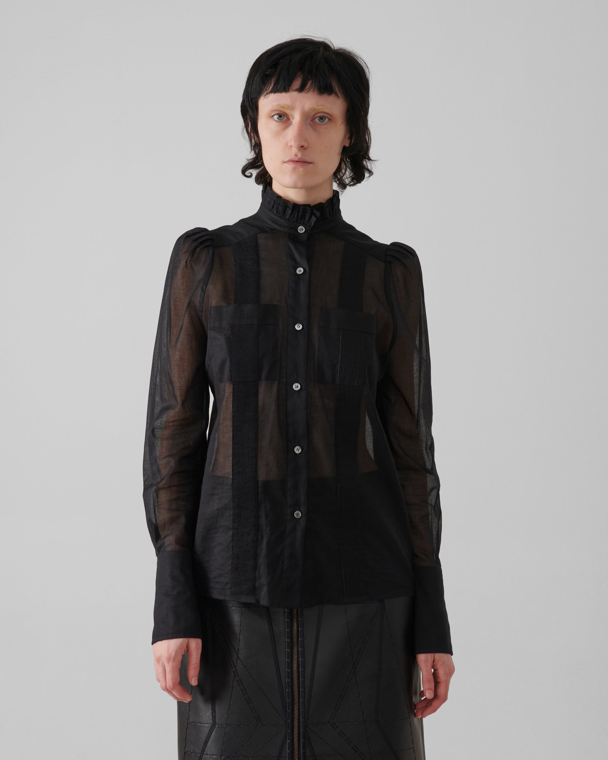 1. cre ar+ {uno crear más} lends a romantic architecture to workwear codes with this high-neck blouse, crafted from sheer cotton voile. The silhouette is defined by a softly ruffled stand collar, pintucked bodice panels, and subtly puffed shoulders that create volume in tension with its delicate transparency. Patch pockets and tonal buttons anchor the design in function, while the meticulous detailing speaks to artisanal craft.