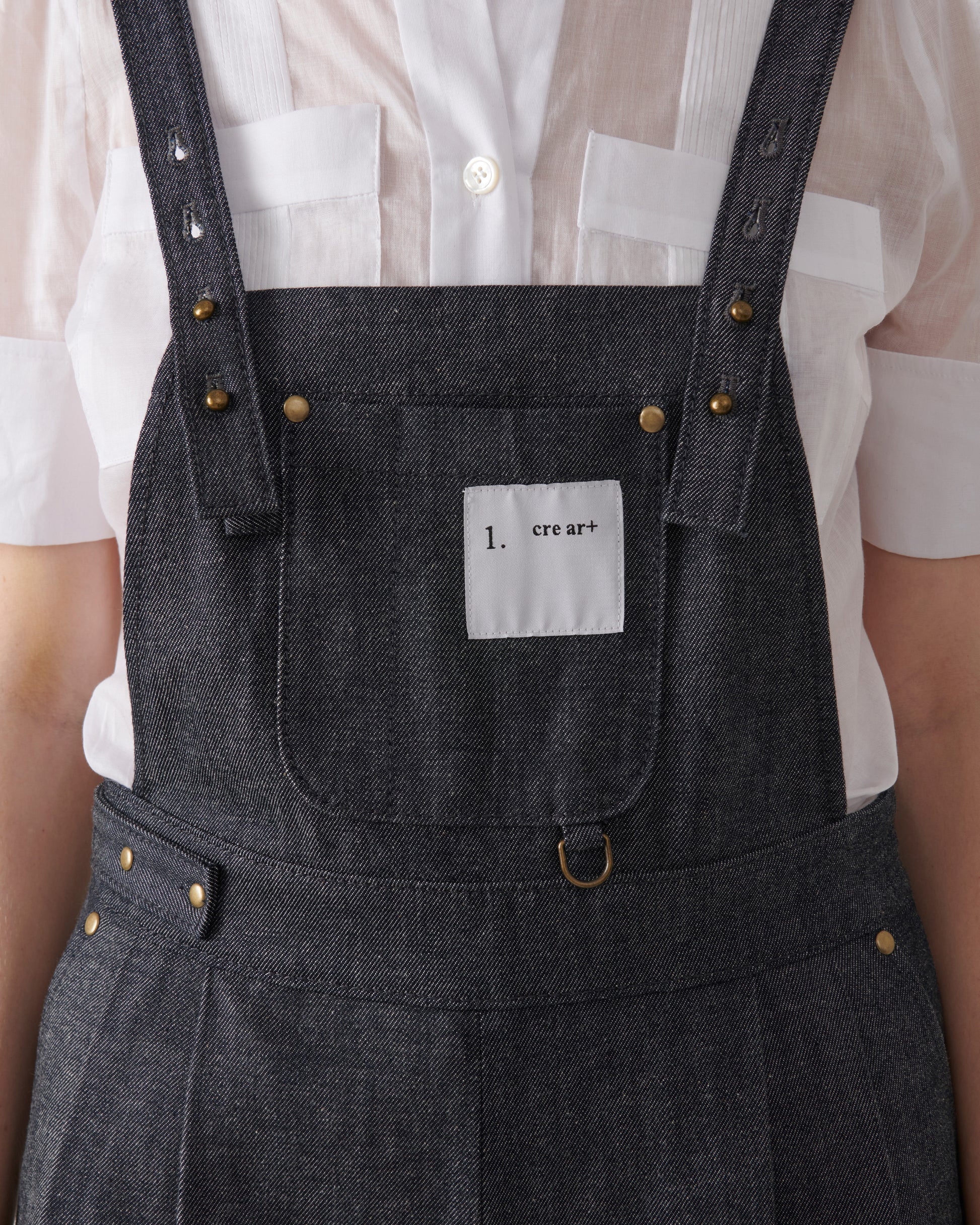 These tailored wide-leg overalls are the original garment that inspired the creation of 1. cre ar+, establishing the brand’s vocabulary of structure, craft, and intentional design. Cut in a deep charcoal Japanese-inspired denim, the silhouette is clean and architectural, sitting high on the waist with soft pleating and a long, elongated leg line finished with a hand-turned cuff.