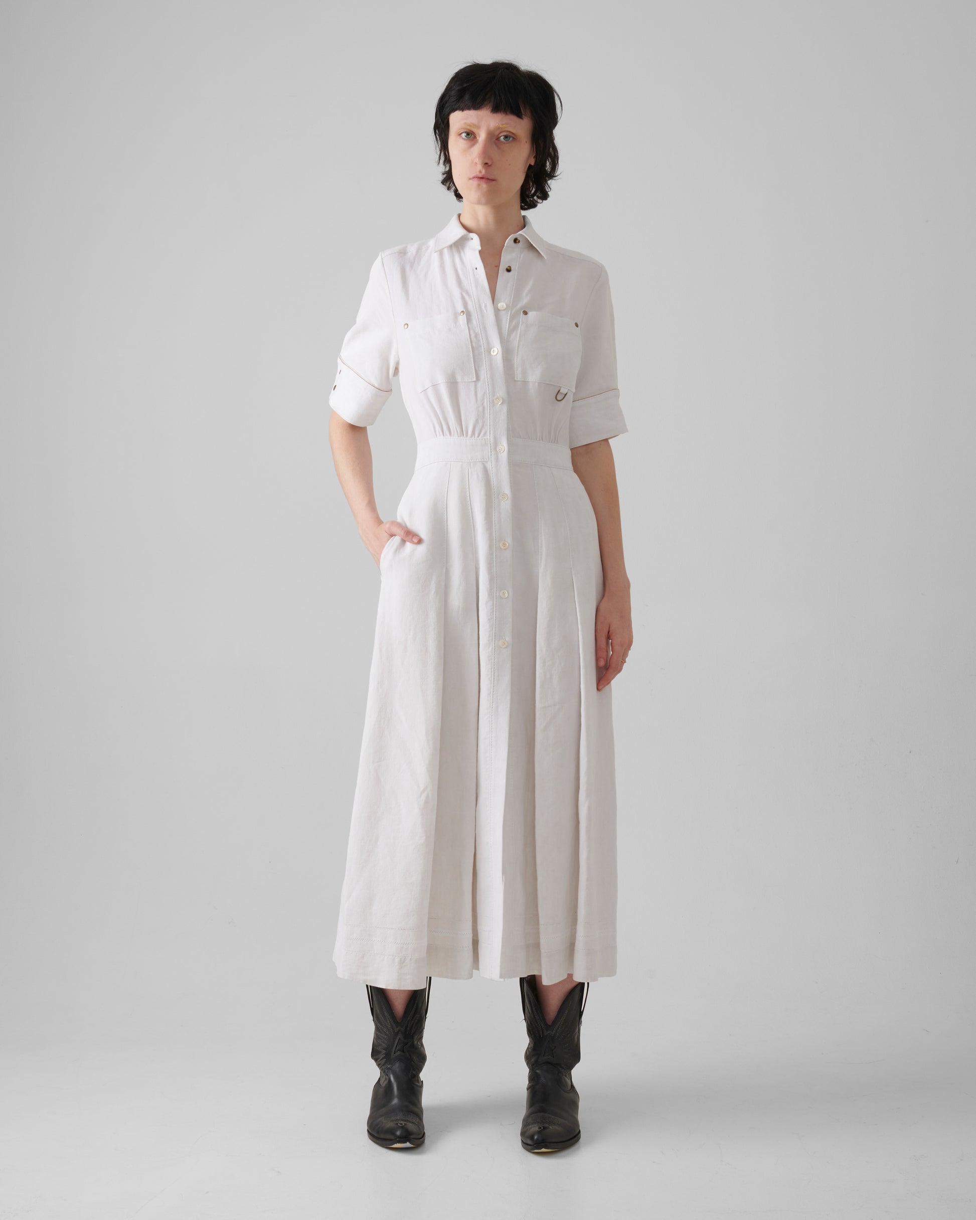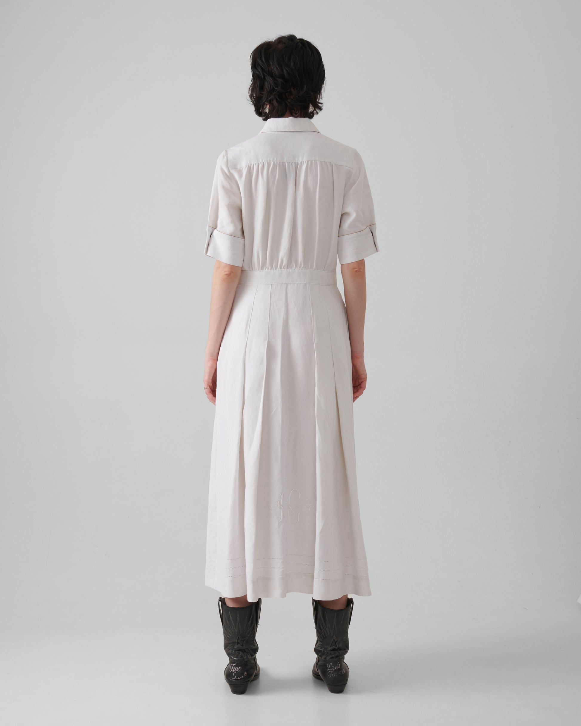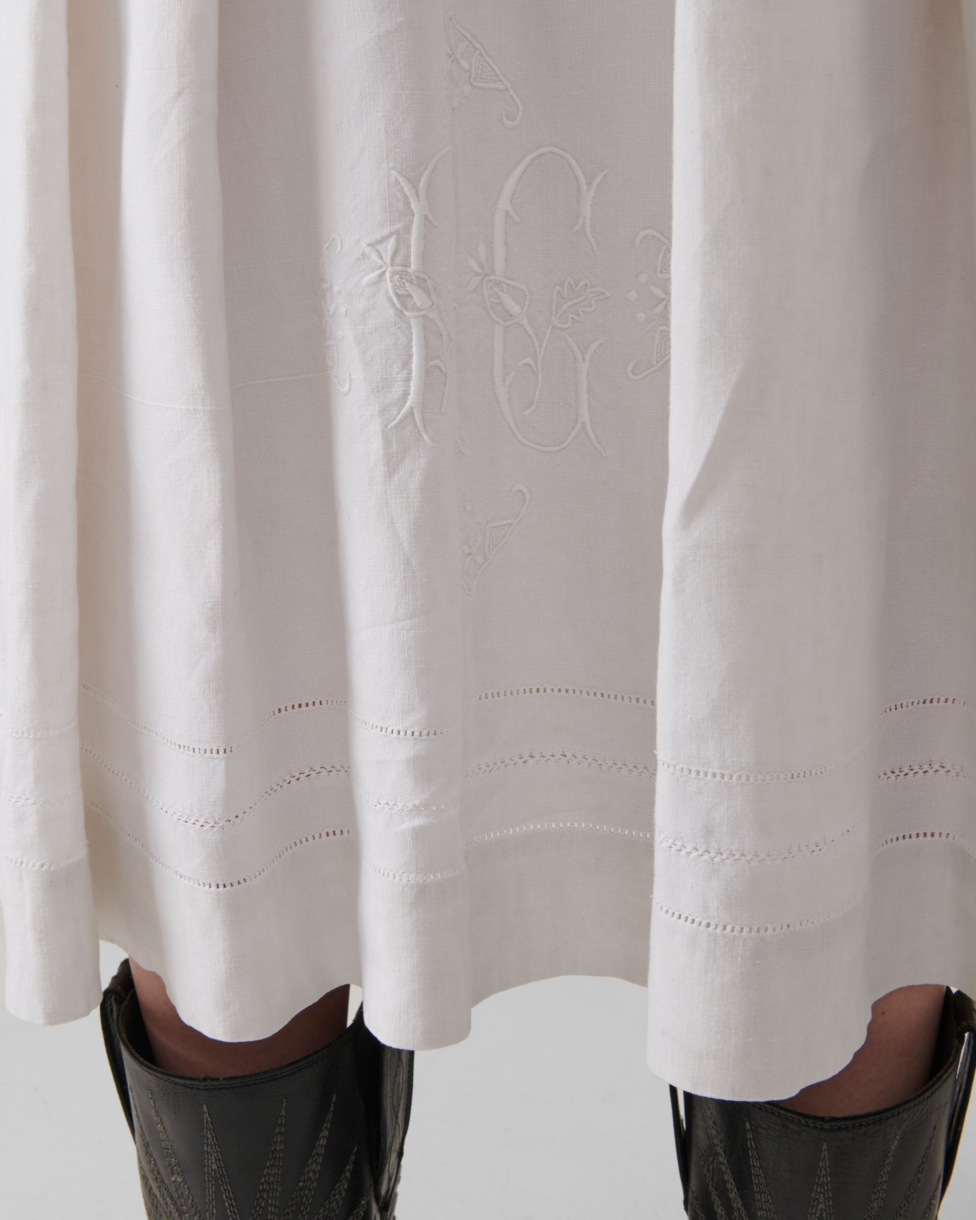 The Marker Shirtdress is crafted from vintage linen reimagined with architectural clarity. Tablecloth heritage is preserved in embossed embroidery and a fagoting hem, while exposed red-white denim selvedge seams and antique brass rivets bring utilitarian strength. Pleated panels and french seams refine the silhouette, balancing artisanal intimacy with modern precision.
