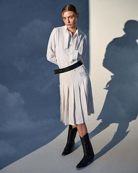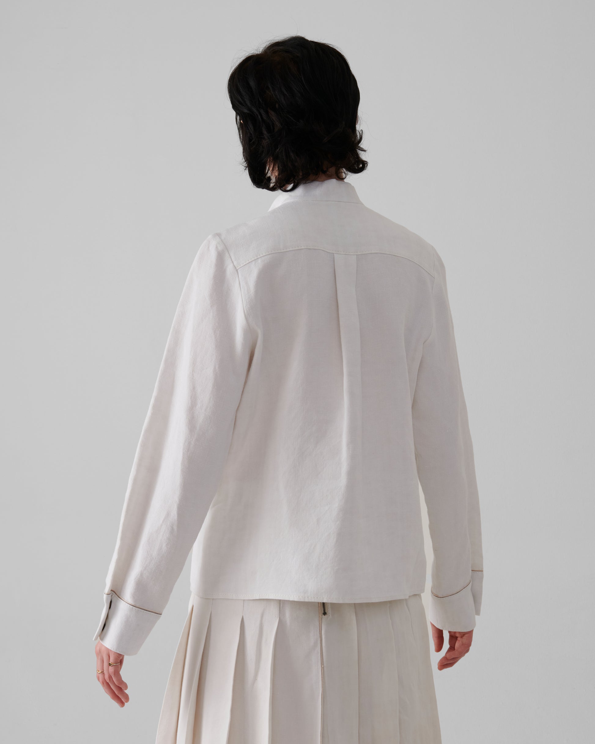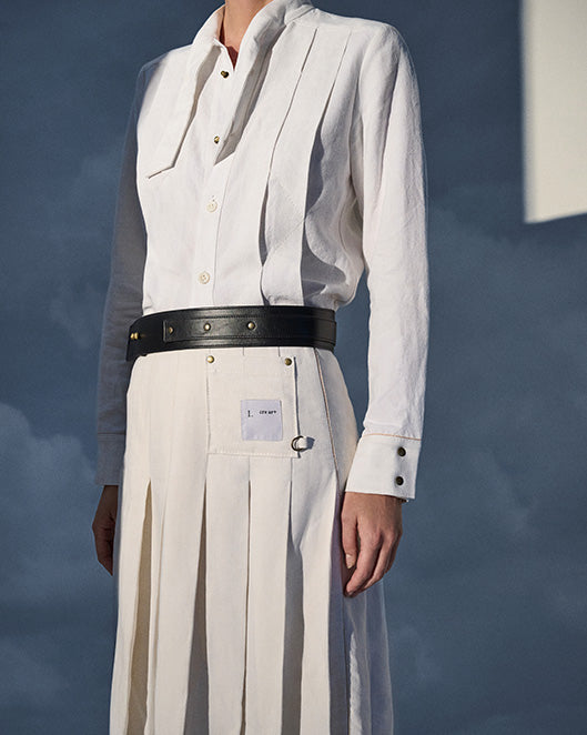 The Market Shirt is cut from French country linens reimagined with architectural precision. Tablecloth remnants are elevated into tailored form, while diagonal topstitching recalls the geometry of Deco Capsule linework. Denim selvedge detailing at the cuffs and french seams underscore its structural clarity. Finished with mother-of-pearl buttons, antique brass snaps, and stud closures at the neckline, the piece merges artisanal intimacy with modern utility.